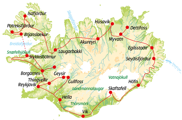 De weg slingert zich langs de fjordinhammen en verschillende tunnels zuidwaarts via Holmavik naar Bru, waar u weer op de ringweg no.1 komt. Overnachting in de Gauksmýri Lodge, vlak bij Laugarbakki (ca.370 km).